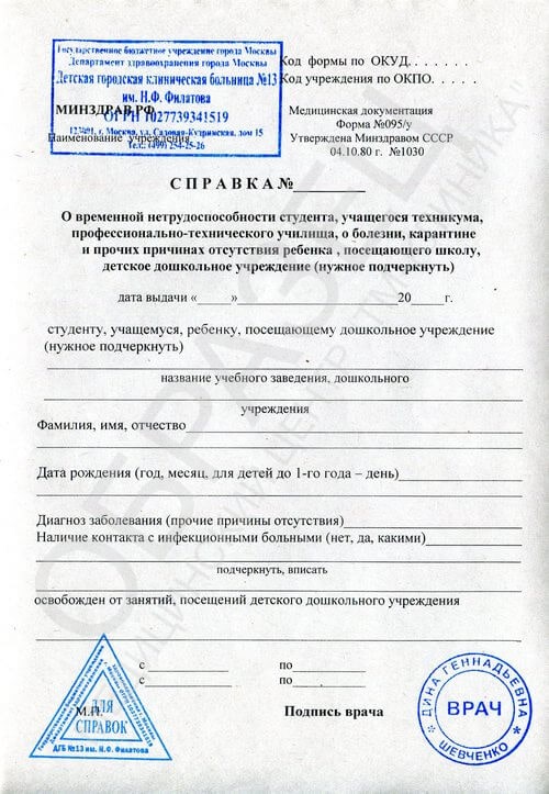 Мы поможем купить медицинскую справку-освобождение о болезни на работу, учебу, для академа, детский сад и школу. Наш менеджер обращается в клинику, договаривается со знакомым врачом и оформляет бумагу. Все официально и без трудностей: